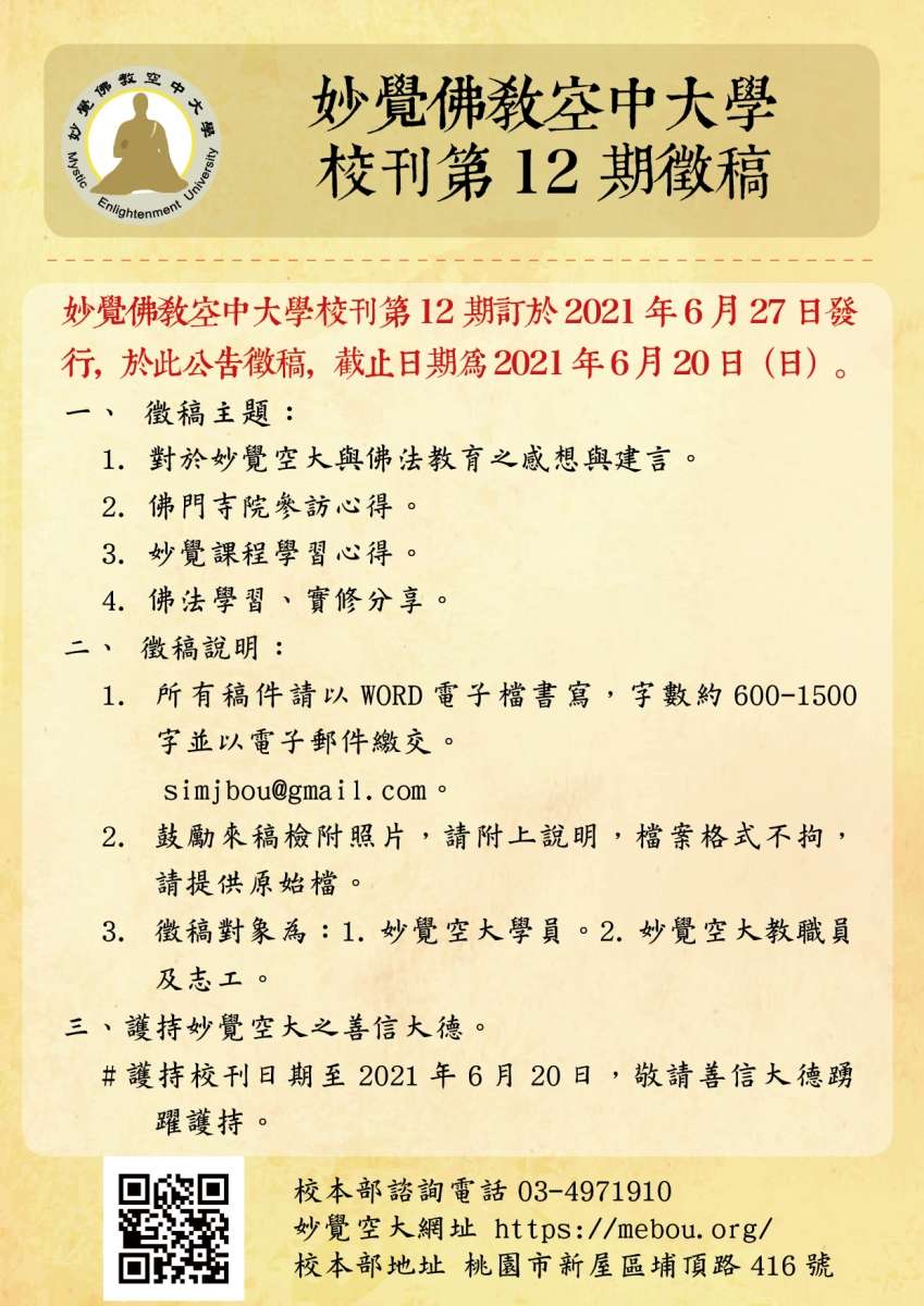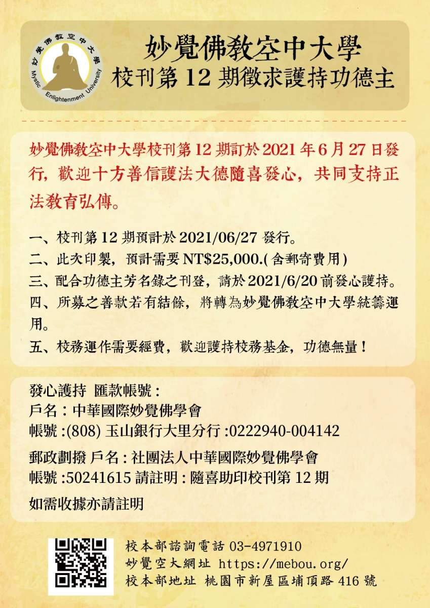 妙覺佛教空中大學校刊─第12期訂於2021年6月27日發行,在此公告徵稿、徵求護持功德主,徵稿及護持截止日期為2021年6月20日(日)。